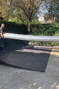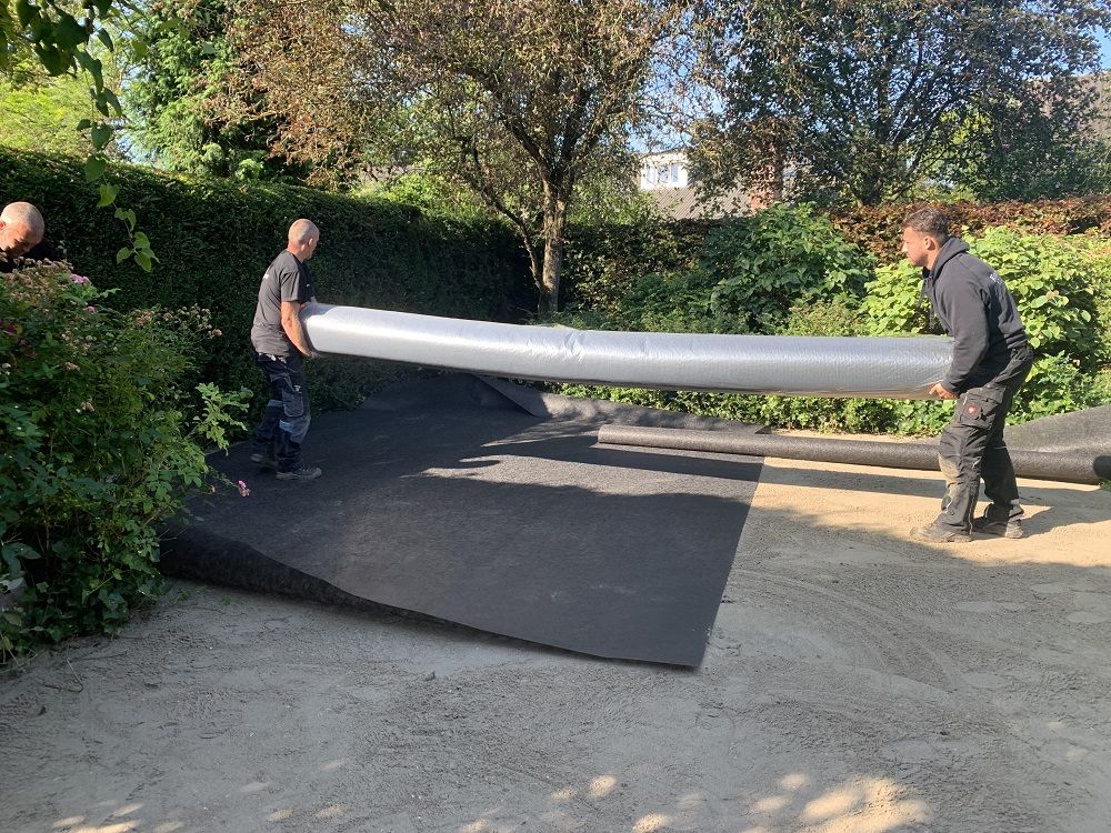 Hierbij wordt het drukverdeeldoek aangebracht. Dit zorgt ervoor dat er geen dalen en putten ontstaan in de ondergrond onder het kunstgras. Zulke hoogteverschillen zijn namelijk duidelijk te zien in het kunstgras. Van der Hout adviseert om te kiezen voor doek van een iets dikkere kwaliteit; dit zorgt voor net wat meer stabilisatie. Het doek wordt aan de randen afgesneden met een stanleymes met een gebogen (haak)puntje.