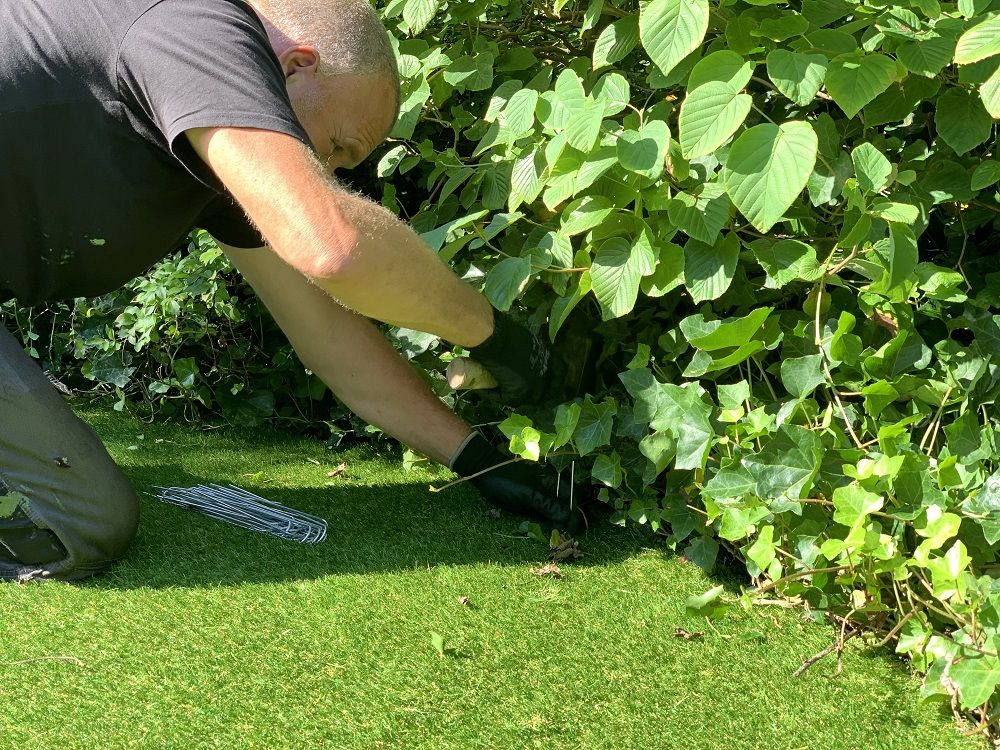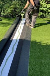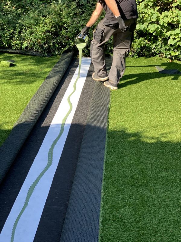 Na het aanbrengen van het drukverdeeldoek is het tijd voor het uitrollen van het kunstgras. Het kunstgras van Kunstgrasboer.nl wordt geleverd op rol, waarbij hoveniers altijd 10 procent extra krijgen in verband met de speling bij de snijranden. In deze tuin bevindt zich één naad in het midden van het kunstgras. Hier worden de delen aan elkaar bevestigd met een lijmband en kunstgraskit. Maar eerst wordt er een klein randje van de rol afgesneden. De Zoete: 'Zo zorg je ervoor dat je later geen naad meer ziet. In de fabriek worden de randen gesneden door een machine, waarbij soms ook de grasharen worden meegesneden. Dit kan later een lelijk beeld geven. Snij daarom direct langs een lijn grasharen zo'n 1,5 centimeter van de rol, zodat de delen mooi op elkaar aansluiten.' De kit wordt direct op de lijmband aangebracht en vervolgens uitgesmeerd. Klanten wordt geadviseerd om het grasveld de eerste 24 uur nog niet te betreden, zodat de kit goed kan uitharden. Een lijmband wordt aangeraden, omdat je dan bij eventuele latere verzakkingen de gehele kunstgrasmat kunt optillen zonder dat het drukverdeeldoek vastgelijmd zit.