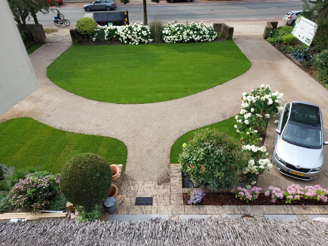 Jurrien van Aggelen is eigenaar van Machineverhuur Midden-Nederland in Lunteren en verwerkt al enkele jaren Achterhoeks Padvast voor Hardeman. Zo ook in Arnhem bij de statige woning aan de Velperweg. 'Vorig jaar is de achtertuin onder architectuur aangelegd. De architect tekende paden en terrassen van Achterhoeks Padvast. De bewoners zijn er zo enthousiast over, dat de voortuin nu ook is aangepakt en ze willen deze halfverharding ook voor de oprit. Het huis is in tweeën gedeeld, al zie je dat niet direct aan de buitenkant. Het had eerst twee aparte opritten. Nu hebben de bewoners gekozen voor een constructie waarbij de oprit wordt gedeeld en waarbij ze allebei de oprit vooruit kunnen op- en afrijden. In totaal gaat het dan om 300 m2 oprit van Padvast. Padvast oogt natuurlijk en heeft een rustige uitstraling, wat goed bij deze woning past. Daarnaast is het makkelijk in natuurlijke vormen te verwerken. En dat laatste is natuurlijk interessant als je kijkt naar de investering in tijd. Achterhoeks Padvast is goedkoop wat betreft arbeid. Als de oprit en de paden in de achtertuin van klinkers zouden worden gemaakt, dan zou dat enorm veel tijd kosten en is er ook afschot nodig om het water kwijt te raken. Bij Achterhoeks Padvast hoeft dat niet, omdat het waterdoorlatend is.'