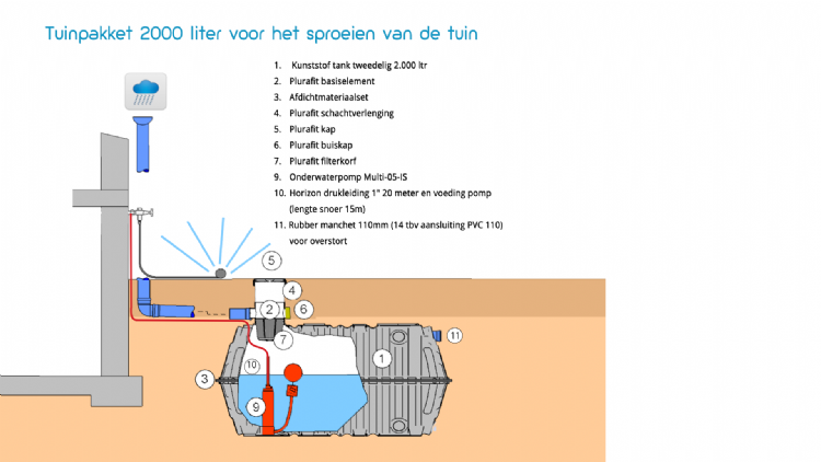 Hij vervolgt: 'Sinds kort zijn wij dealer van ondergrondse wateropslagtanks. Deze hebben een volume van 2000 liter per stuk en worden als bouwpakket geleverd. Een tank bestaat uit twee delen en wordt met behulp van een montagepakket en instructies in elkaar gezet. Tanks kunnen gekoppeld worden, om een groter volume te creëren. Hiervoor hebben we twee standaardpakketten samengesteld, die makkelijk te plaatsen zijn. Alle componenten die nodig zijn voor de installatie, zitten in het pakket. Het gaat om een tuinpakket voor het sproeien van de tuin en een huispakket voor het spoelen van het toilet en voor de wasmachine. Dit laatste pakket wordt compleet met niveaumeter met suppletie geleverd. Die zorgt ervoor dat de tank nooit leeg komt te staan. Uiteraard gaat de overstort van de tank op een infiltratievoorziening die gemaakt is van onze Hydrorockblokken.'