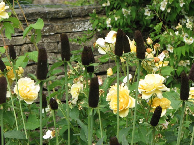 Wat is de natuur toch veelzijdig! Er zijn nu al acht sterke Rudbeckia's de revue gepasseerd; nu komt er weer één, die totaal verschilt van de rest. De hoogte is ongeveer 150 cm. De bloeitijd is zoals bij de andere soorten, maar een bloeiwijze zonder de aanwezigheid van kroonblaadjes hadden we nog niet gehad. Het zijn grote opstaande donkerbruine kegels, ondersteund door een randje kelkblaadjes, die fier boven gladde het groene blad staan op stevige stelen. Daardoor blijven ze nog langer intact dan bij de soorten mét bloemblaadjes. Als geel toch te heftig is, kan deze makkelijke plant worden ingezet in groepen, of informeel 'gestrooid' tussen grassen op grote open plekken.