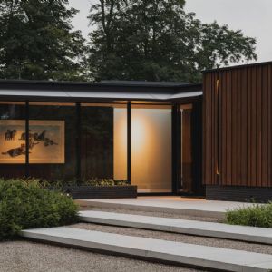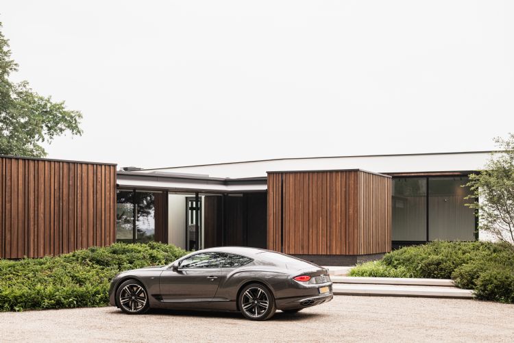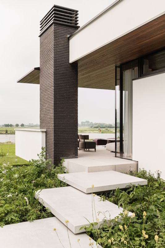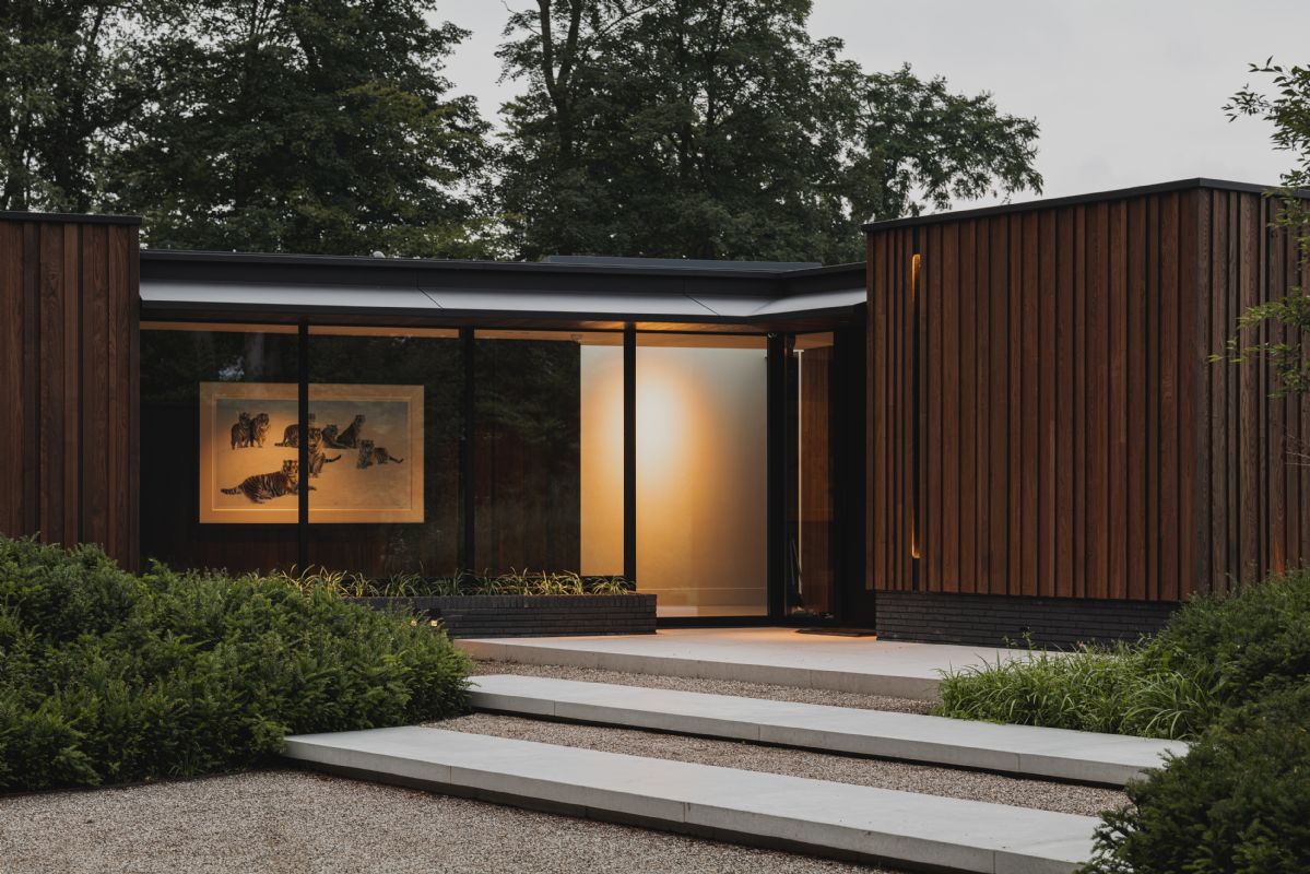In het Gelderse Gorssel heeft hovenier en tuinontwerper Michiel Bosch prachtig werk geleverd. Via een meanderende oprijlaan door het bos kom je bij een strakke moderne woning terecht. De entree is indrukwekkend door de maatwerk-betontrappen van Ebema, Megasmooth. Zeker in combinatie met de natuurlijke look van het Achterhoeks padvast van de parkeerplaats en oprijlaan werkt het geheel verrassend goed.