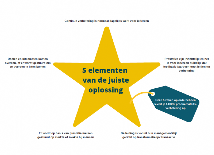 Eerder behandelde Peelen al de vijf elementen van productiviteit. Als je deze vijf zaken op orde hebt, levert dat een productiviteitsverbetering van meer dan 100 procent op.