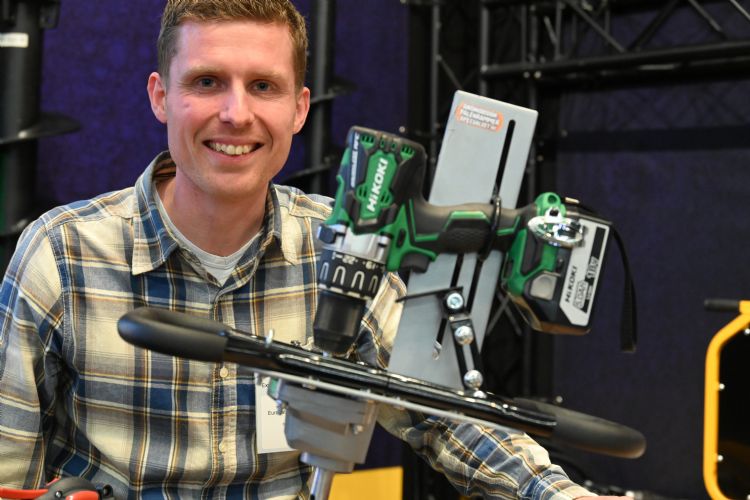 Emiel Jansen van Eurogate liet op de beurs dit handige apparaatje zien. Hiermee kun je een gewone accuboormachine omtoveren in een grondboormachine.