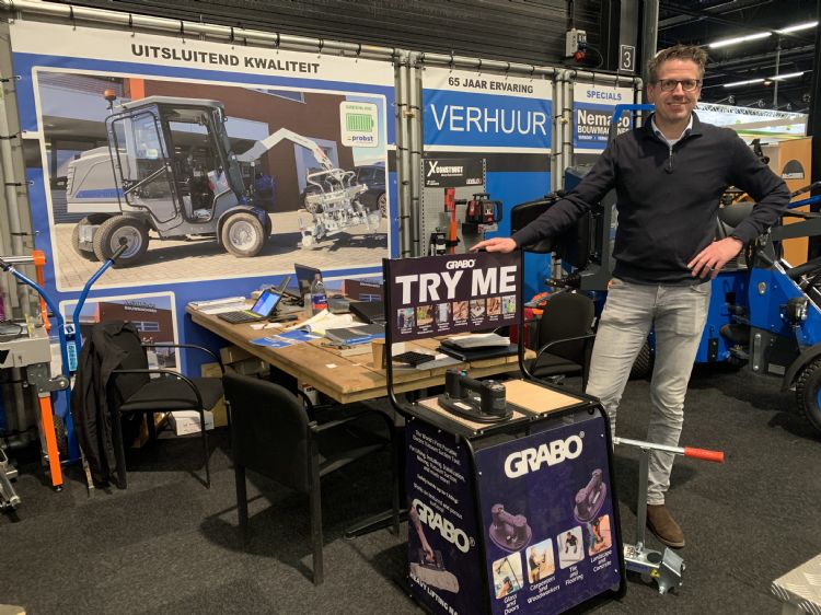 Op de stand van Nemaco Bouwmachines was de nieuwe accu tegelzuiger van Nemo Grabo Pro te bewonderen. Hermen Krommendijk: 'Met deze tegelhandzuiger kun je gemakkelijk glas, tegels, hout en gipsplaten tillen tot 170 kilo. Zelf hebben wij ook nog enkele hulpmiddelen erbij ontwikkeld waardoor je bijvoorbeeld samen op een eenvoudige manier keramische tegels kan plaatsen.'