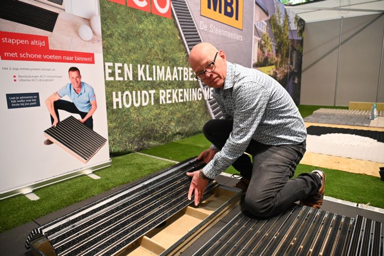 Andre Pes showt in de gezamenlijke stand van ACO en MBI een schoonlooprooster dat hoveniers direct bij het bestraten in kunnen bouwen in een terras. Voor het rooster dat is geproduceerd uit polyester zijn drie verschillende matten leverbaar. Pes: 'Dit is echt zo'n product waarmee je als hovenier het verschil kunt maken. Hoveniers melden mij: "Klanten vragen hier niet om". Ja dat klopt daarom moet je dit actief aanbieden.