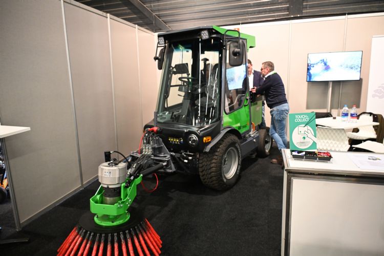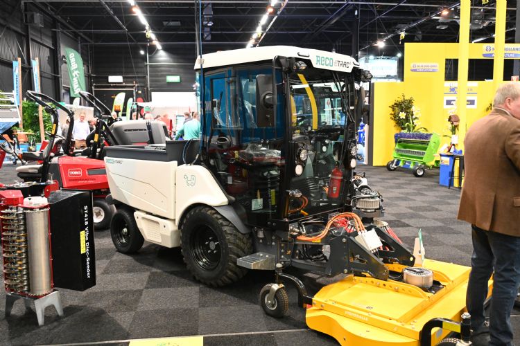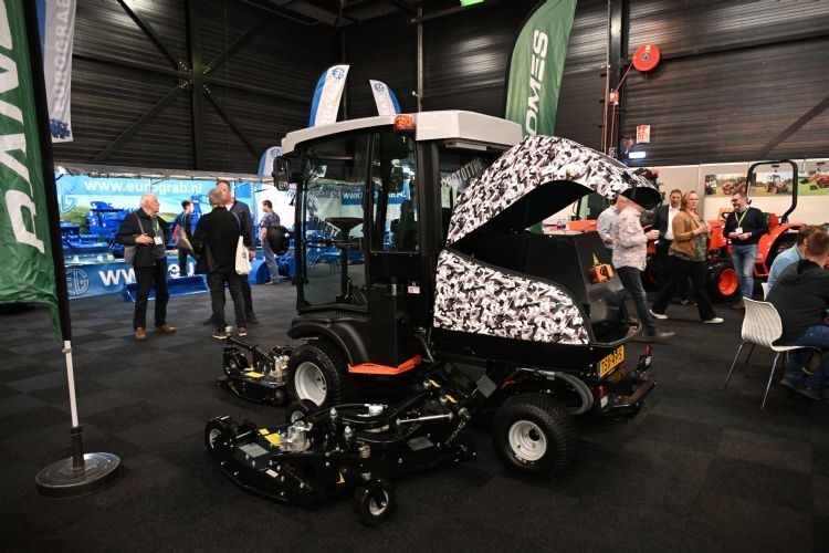 Niet helemaal nieuw meer: op de stand van Jean Heybroek stond deze Reco E-track. Een vol elektrische werktuigdrager. Hier voorzien van een elektrisch aangedreven maaidek