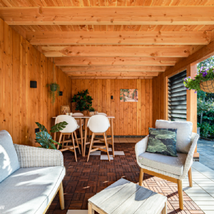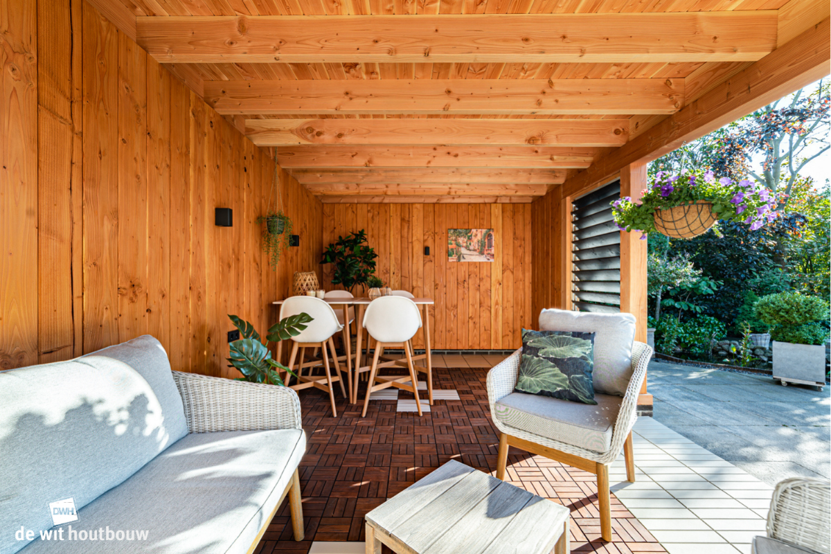 De vraag naar afwerking is ook hoger dan voorheen, merkt Schra. Klanten van de hovenier vragen om bekleding van de veranda, of een gevel die een leuk accent vormt in de tuin. Waar het vroeger vooral naturel vergrijsd of zwart hout was, is er nu meer vraag naar andere natuurlijke tinten. 'Duurzaamheid, kleur en het beschikbare budget bepalen de keuze van de klant voor een bepaalde gevelbekleding. Waarbij "duurzaam" een term is die wat mij betreft te veel gebruikt wordt en die op meerdere manieren in te vullen is. Hout is per definitie al duurzamer dan een betongevel. Naast het voordeel van het lichtere gewicht is de CO2-uitstoot bij de productie van hout veel lager. De houtsoort accoya gaat het langst mee: 50 jaar. Dat is duurzaam te noemen. Maar houtcomposiet is met 95% gerecycled kunststof ook erg duurzaam. Overigens heeft accoya als enige housoort het Cradle to Cradle Gold- certificaat, wat inhoudt dat zowel het hout als het productieproces volledig duurzaam is.'