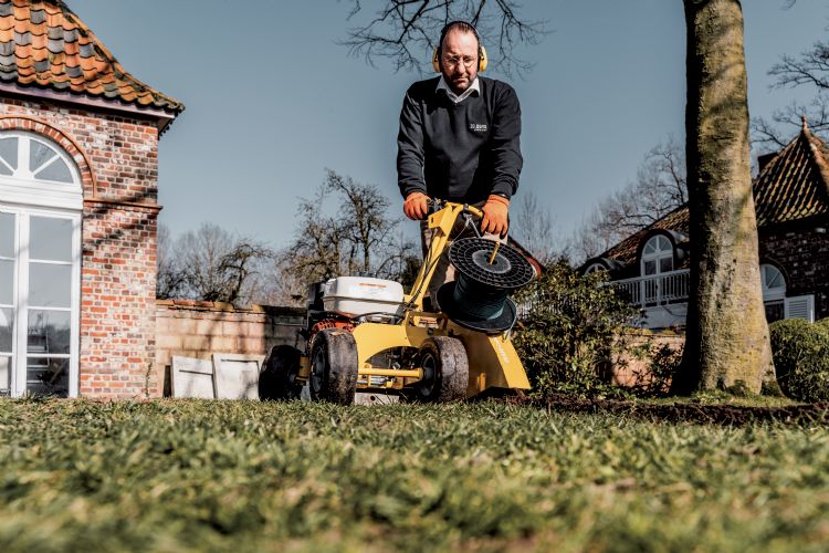 Maar hoe werkt het dan met het kabelleggen? Beauprez vertelt: 'Daarvoor monteer je het enkelvoudige mes en de smallere afschermkast op de machine. Dit is een kwestie van drie bouten en drie sterschroeven losdraaien. De machine is dan gereed om een messcherpe en rechte sleuf te frezen door de bodem. Het enkelvoudige freesmes heeft ook drie uiteinden met widiapunten en de werkbreedte hiervan is circa 1 duim.' Zo'n kaarsrechte sleuf maakt het gemakkelijker om vermoeiende taken uit te voeren, zoals het plaatsen van een afrastering voor huisdieren of een borderrand van kunststof of cortenstaal. Ook golfvormige borderranden van kunststof kun je zo gemakkelijk in de grond steken. En dan het kabelleggen, hoe gaat dat in zijn werk? Beauprez: 'Dit enkelvoudige mes werpt maar weinig aarde omhoog. Voor het kabelleggen beschik je over een tweede, met een geïntegreerde kabelhaspel en een beschermende gebogen buis. Die laatste zorgt ervoor dat de kabel in het verlengde van het freeswiel onder in de sleuf komt te liggen. Het is een ideale manier om in één werkgang bijvoorbeeld perimeterdraad voor een maairobot of draad voor tuinverlichting in te werken, zonder noemenswaardige schade aan de graszode te veroorzaken. Dit soort werkzaamheden doe je altijd achteruitlopend langs een uitgezette lijn. Je hebt goed zicht op het werk en het freeswiel draagt bij aan de voortgaande beweging van de machine. De machine zelf heeft namelijk geen aandrijving.'
