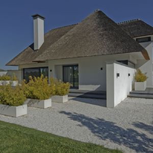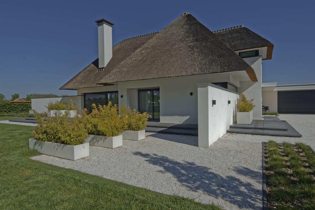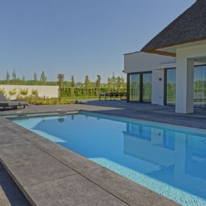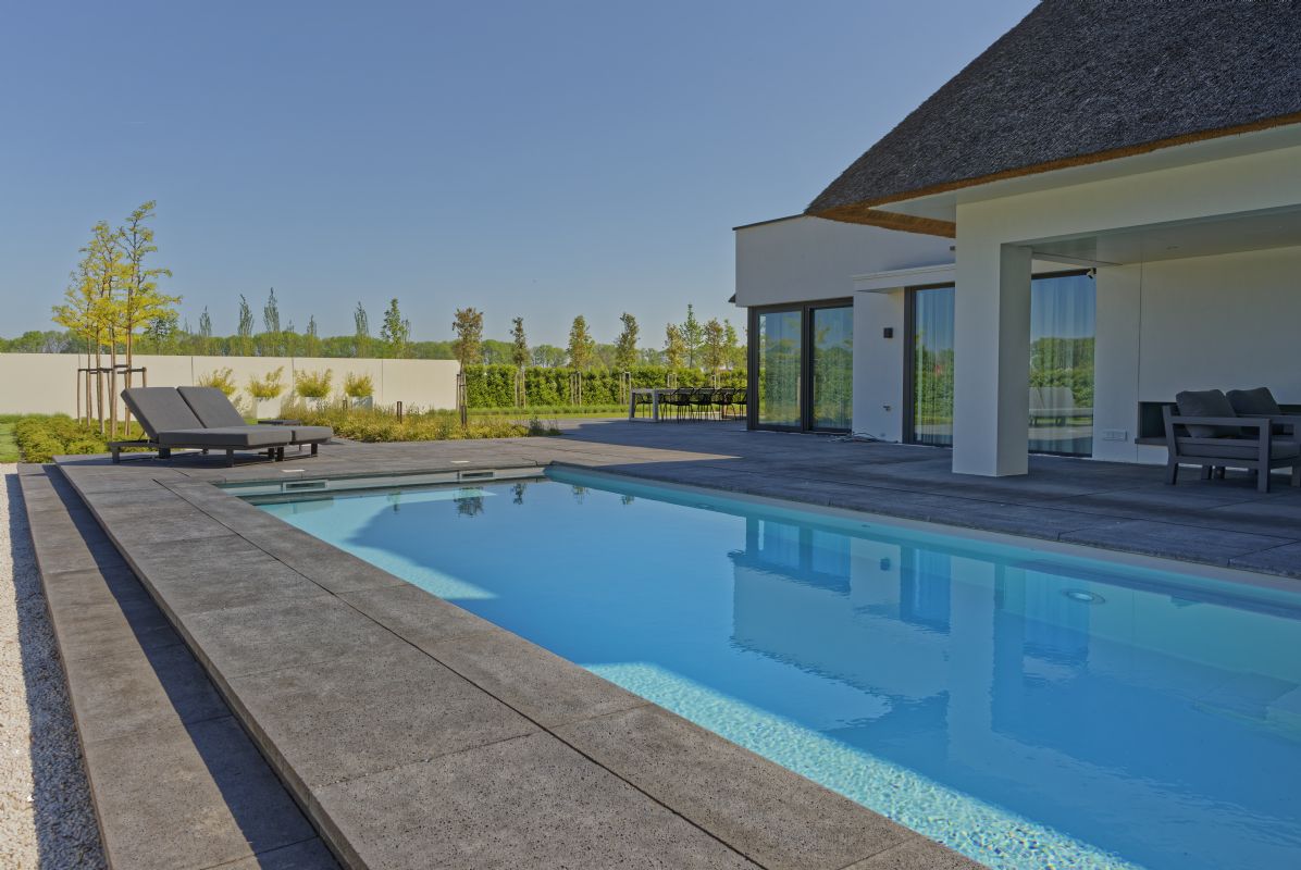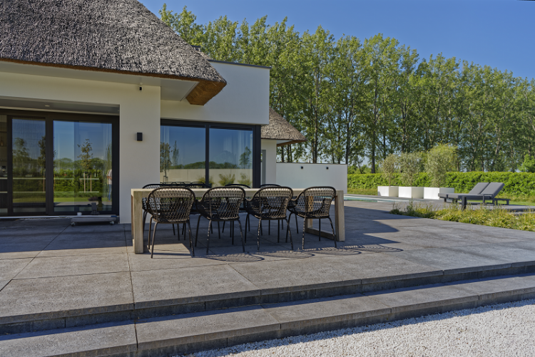 Een tuin die weinig onderhoud vereist, dat was de wens van de klant, vertelt Eric Bijl van Eric Bijl Tuinontwerp, die het project mocht realiseren. 'Samen met de klant en de architect hebben we onze ideeën gecombineerd tot één duidelijk plan. Het gehele project duurde uiteindelijk ruim drie maanden.' Over de gehele tuin verspreid zijn tegels van 1 bij 1 meter van Schellevis gebruikt om die moderne en ruimtelijke uitstraling te creëren. Tijdens de realisatie van de tuin was er wel een uitdaging: alles moest voor het oog zo vlak mogelijk liggen. Dit is gelukt door middel van goten en drainage. 'Het was de wens van de architect om alles zo vlak mogelijk te houden. Dat past ook bij de uitstraling.'