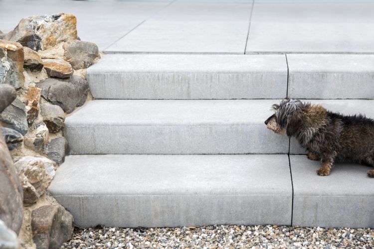 Voor de trappen koos Van Eijk voor de Megatrap Carreau van Ebema Stone&Style, kleurvariant Arduna. De treden zijn leverbaar in een lengte van 50 of 100 cm en er is keuze uit vijf kleurtinten. Het terras bestaat uit Megategels Carreau uit dezelfde lijn, met afmetingen van 120 bij 80 bij 6 cm. Tuinhelden kiest vaker voor Ebema Stone&Style: 'De betonnen producten zijn van een goede kwaliteit. De tegel is een vrij strak en modern uitgevoerd met een minimale facetrand, zodat er heel weinig ruimte tussen de tegels overblijft met smalle voegen.'
