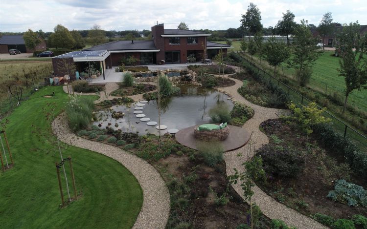 De bewoners van de strakke, moderne woning wilden graag een natuurlijke tuin met organische vormen, een zwemvijver zonder vis en planten en een natuurlijke vijver met vis en planten. Hoveniersbedrijf Tuinhelden uit het nabijgelegen Helden is gespecialiseerd in vijvers. Van Eijk: 'In de tuin zijn er wat hoogteverschillen. Deze hebben we opgevangen met betonnen Ebema Stone&Style-traptreden. Voor zwemvijvers kiezen wij altijd beton en geen natuursteen of folie. Met beton houd je grip, het wordt amper glad en er blijft minder aanslag op zitten.' Er gaat een trap de zwemvijver in en er is ook een korte trap aangelegd voor het hoogteverschil tussen het terras en de rest van de tuin.