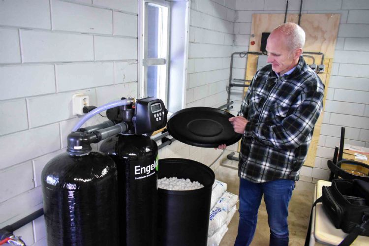 Na de voorfiltrage komt het bronwater in één van de twee zwarte flessen, hier op de foto. Dit is de feitelijke installatie die het water ontijzert en ontkalkt, maar ook andere mineralen verwijdert. Die mineralen zijn opgelost en laten zich niet mechanisch verwijderen. Van Wijhe zegt: 'Officieel heten de flessen ionenwisselaars. Met behulp van kunsthars zuiveren ze het bronwater. Om dit proces goed te laten verlopen, mag de doorstroom niet te hoog zijn. Die doorstroom kun je digitaal uitlezen en eventueel knijpen. De meetapparatuur registreert ook het aantal kubieke meters gezuiverd water. Op enig moment verliest de kunsthars zijn werking en schakelt de installatie automatisch over op de tweede unit. De gebruikte fles moet geregenereerd worden, met een specifieke zoutoplossing in tegenstroom. Ook dit gebeurt automatisch. Hiervoor hoef je net als bij een vaatwasser alleen maar te zorgen dat er voldoende zoutblokjes in een container zitten. Het mineraalrijke afvalwater wordt door de eigenaar afgevoerd via het riool.'