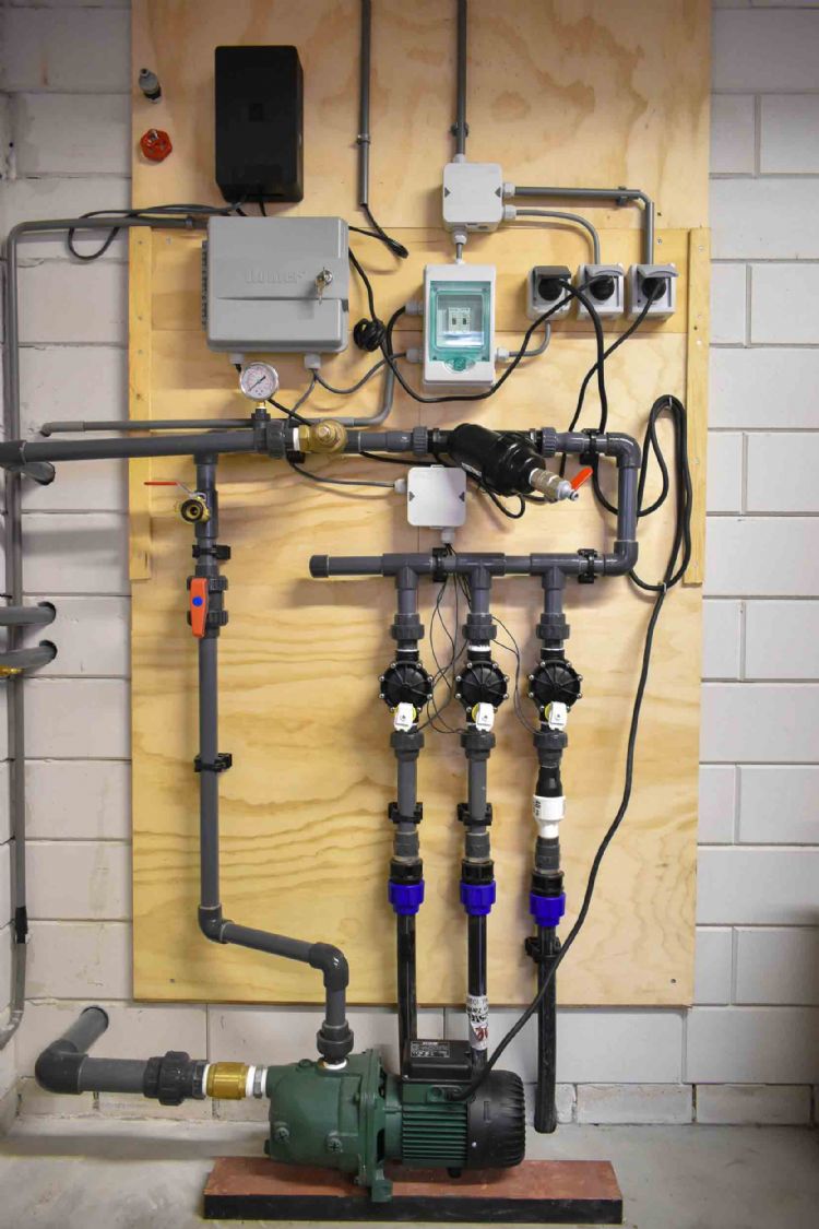 Van Wijhe ging aan de slag onder zijn motto: wat er al is, kunnen we misschien opnieuw gebruiken. Dat deed hij met het tuinontwerp, een passer, kleurpotloden en een rekenmachine in handen. Hij vertelt: 'Mijn insteek is altijd: als iets niet goed loopt, sta ik er toch voor mijn klanten en los ik het probleem op. Bij advisering ben ik gewend zo'n installatie van begin tot eind te tekenen, compleet met alle onderdelen. Die schets, gemaakt met verschillende kleurpotloden, bewaar ik altijd. Zelfs als het niet meteen tot een offerte komt! Ik heb dus altijd inzicht in een installatie die iemand ergens heeft aangelegd of wilde aanleggen. Mijn werk start altijd met het intekenen van (pop-up)sprinklers voor gazon en borders en druppelslangen voor perken. Daarbij richt ik de straal van de sprinklers altijd van de woning of het terras af. Dit voorkomt vaak al een groot deel van de ijzer- en kalkproblematiek. In een volgende stap bepaal ik hoeveel beregeningswater er nodig is per uur, door dat van alle beregeningspunten bij elkaar op te tellen. Gelijktijdig noteer ik al het materiaal dat daarvoor nodig is. Vervolgens richt ik me op de bron, de bronpomp en de terugslagklep. Met de bron was niets mis en er zat gelukkig geen nitraat in het bronwater, wat we ook weleens aantreffen. Een ontijzerings-/ontkalkingsinstallatie bleek onvermijdelijk. Wel vond ik het nuttig de oxidatie van het ijzerhydroxide in het bronwater tegen te gaan, door te zorgen dat er geen zuurstof in de bron kon komen. Dit om het voorfilter, dat naast ijzer- en kalkmineralen ook zanddeeltjes tegenhoudt, zoveel mogelijk te sparen. De onderwaterbronpomp leverde circa drie kubieke meter per uur. Die capaciteit zou toereikend zijn als we met drie beregeningsgroepen zouden gaan werken, die we na elkaar inschakelen. De bronpomp perst het water naar de schuur. Daar gaat het eerst door een demontabel voorfilter. Kranen bieden de mogelijkheden het in- en uitgaande (bron)water van dit filter te beoordelen.'
