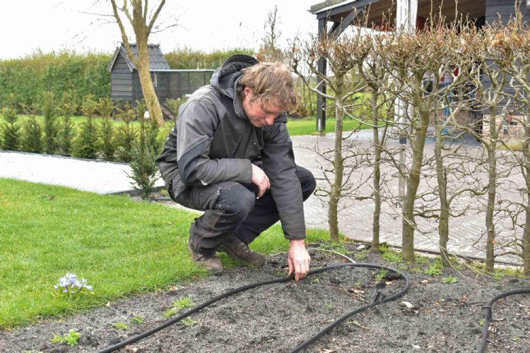 Nagenoeg alle leidingen, pompen en elektriciteit en elektronica zijn door Hoveniersbedrijf Van Gelder aangelegd. Dit werk heeft Adriaan van Gelder al veel vaker gedaan. De leiding vanaf de buffervaten gaat naar een kleine, nieuwe 230V-centrifugaalpomp op de vloer. Van Wijhe berekende de maximale capaciteit hiervan op 4,8 kubieke meter. Van Gelder: 'Deze pomp zuigt water uit het buffervat en perst dit in het aangelegde beregeningsnetwerk. Afhankelijk van welke klep de beregeningscomputer heeft opengezet, gaat er water naar de pop-upsprinklers voor de gazons, de vernevelsproeiers voor de borders of naar de circa 200 meter druppelslang die als één ringleiding is aangelegd. Met de laatste voorzien we bomen en struiken van vocht. Sensoren houden de juiste druk in de gaten in de afzonderlijke groepen. Ze functioneren tevens als droogloopbeveiliging voor de perspomp voor de beregening. Bij de groep met sprinklers hanteren we een druk van circa 4 bar, terwijl de druppelslangen hun water afgeven bij een druk van 2,7 bar. De 32 mm hoofdleiding hebben we ingegraven voordat we met de feitelijke tuinaanleg startten. Daarop zijn conform het beregeningsplan de dunnere leidingen aangesloten, waarbij we gebruikgemaakt hebben van aanboorzadels om de pop-upsprinklers aan te sluiten.' Van Wijhe geeft hierop nog een aanvulling. 'Die druppelslang laten we zelf produceren, omdat Engeldot hiervoor in tien jaar tijd een enorme afzet kreeg, tot in de veehouderij aan toe! Het is een zeer duurzame slang; onder elk gaatje zit namelijk een klein inwendig membraan. Dit voorkomt verstopping en zorgt ervoor dat ongeacht de lengte elk gaatje dezelfde hoeveelheid water afgeeft. Voor het overige is op dit project dus sprake van een beregeningsinstallatie waarbij in de tuin geen enkele elektrisch bediende klep is toegepast. Lang niet alle hoveniers blijken bekend met dergelijke systemen en het installeren hiervan. Wij leveren deze systemen en begeleiden de hovenier door het hele proces, van de berekening tot de installatie. Als ontijzering noodzakelijk is, blijven sierbestrating, maar ook materiaal zoals druppelslangen, sprinklers en de nozzles die we daarvoor leveren langer goed. Ze kunnen namelijk niet verstopt raken door ijzer- of kalkdeeltjes. Een hovenier die dit kan aanbieden, levert een completere dienst en onderscheidt zich hiermee van de gemiddelde hovenier.'