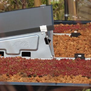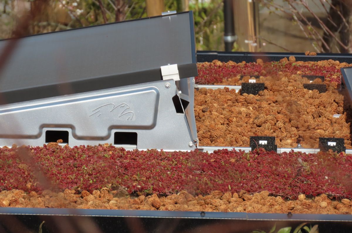 Van grondbedekking en wandelpad tot sedumdak De perziksteen van Nocciolo is niet het enige duurzame element dat op de twee kavels te vinden is. Op platte daken ligt vaak zwaar grind, dat na een tijdje groen uitslaat en om de zoveel tijd schoongemaakt moet worden. Earth Kweek, een bedrijf dat gespecialiseerd is in groendaken, heeft daar een oplossing voor gevonden, die ook te vinden is op de twee kavels van Europarcs. 'Als je korrels kurk op de juiste manier verwarmt zet het uit en wordt het door zijn eigen hars gebonden. Deze geëxpandeerde kurk wordt door Earth Kweek gebruikt als natuurlijke isolatie en drainage', legt Sven Hazekamp van Nocciolo uit. 'Dit is een stuk duurzamer dan dat zware grind.' Met deze techniek maakt Earth Kweek cassettes op het dak, waar sedum in staat. Waar normaal gesproken een grindrand om het dak heen gelegd wordt, is hier gebruikgemaakt van perziksteen, om het duurzamer te maken. Ook op de wandelpaden tussen de twee huisjes vind je perziksteen, maar wel in een andere vorm. Nocciolo gebruikt de steen in drie verschillende fracties. Gebroken perziksteen garandeert stevigheid en rijcomfort en is ook te vinden op de wandelpaden van de kavel. Ook de gehalveerde steen, die iets groter is, is geschikt om op te rijden. De hele perziksteen is met zijn ronde vorm wat sierlijker.