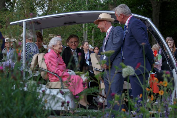 Uiteraard was koningin Elizabeth ook weer aanwezig op de Engelse tuinshow. Op de foto zie je hoe ze lacht naar tuinontwerper Joe Swift (tweede van rechts) en Mark Gregory (rechts), terwijl ze met Keith Weed, voorzitter van de Royal Horticultural Society, wordt rondgereden in een buggy.