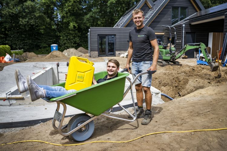 Busser Tuinprojecten beschikt nu over vier groene Noka 160-CT Wide Body-kruiwagens. De 28-jarige hovenier Perry van der Sande werkt vanaf zijn 18e bij dit hoveniersbedrijf. 'Onlangs investeerde mijn werkgever in de derde en vierde Noka 160-CT WB-kruiwagen. Deze vier kruiwagens gebruiken we vooral voor het transport van bladafval, takken en ander groenafval. De keuze voor juist deze kruiwagen ligt voor de hand: met zo'n grote bakinhoud hoef je natuurlijk minder vaak te rijden.'