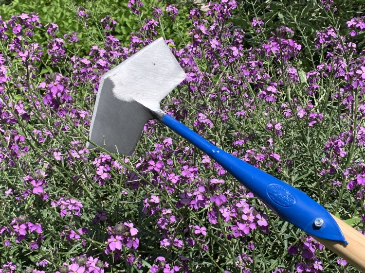 Deze snijdt aan alle kanten en is ook te gebruiken tussen bestratingsnaden. Het is een multifunctioneel ding. De rondschoffel is ook een uitvinding van Derk, alweer zo'n 30 jaar geleden gelanceerd en nog altijd populair.