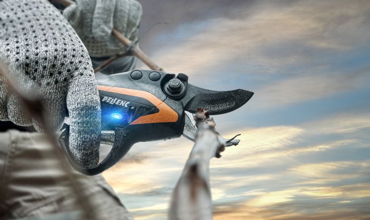 De snoeischaar heeft een snijbeveiligingssysteem dat onder alle weersomstandigheden en zelfs in extreme omstandigheden veiligheid biedt doordat het mes onmiddellijk stopt bij contact met een vinger of hand zonder de speciale Pellenc handschoen.