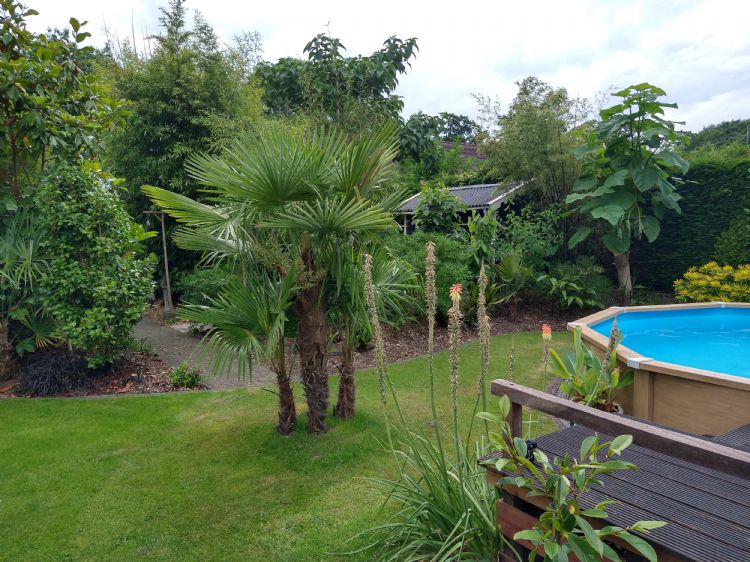 Top tien vorstbestendige subtropische planten in de volle grond1. Trachycarpus fortunei. De enige palm die zonder bescherming onze winters kan trotseren is de Chinese waaierpalm. Eenmaal goed gesetteld, kan de stam jaarlijks een groei doormaken van 20 tot 30 cm. Bekijk bij aanschaf de wortels van de palm door de pot even te verwijderen. Hoe meer zichtbare wortels, hoe beter.2. Fargesia. Fargesia is een niet-woekerende (polvormende) bamboe. Hij heeft als voordeel dat de wortelstokken ondergronds niet aan de wandel gaan. Deze bamboe is er in verschillen vormen en variëteiten. 3. Fatsia japonica. De vingerplant is te vinden op de kamerplantenafdeling in alle tuincentra. Met zijn glimmende blad is het een blikvanger. Deze bladsierplant is in verschillende cultivars te verkrijgen. Speciale aandacht gaat uit naar Fatsia japonica 'Annelise'. 4. Tetrapanax papyrifera 'Steroidal Giant'. Deze plant of kleine boom is in tegenstelling tot de hierboven genoemde exoten bladverliezend. In het voorjaar barst deze exoot echter los en laat dan een enorme groeikracht zien. Bladeren met een diameter van 60 cm zijn niet ongewoon. De plant wil nog weleens voor opschot in de tuin zorgen, maar de wortels zijn zacht van structuur en zullen geen schade toebrengen. 5. Musa basjoo. Een bananenplant is vanzelfsprekend de ultieme exotische blikvanger. Mits hij voldoende voeding en water krijgt, word je getrakteerd op een forse groei. De stam moet tegen vorst beschermd worden, als je hem wilt behouden. De planten groeien het voorjaar erop vanuit de stam verder en kunnen een flinke hoogte bereiken. Beschermen kan door de stammen in te pakken met herfstblad. 6. Schefflera taiwaniana. Enkele jaren geleden was het bijna onbestaanbaar dat we een Schefflera zonder bescherming in de volle grond konden plaatsen. Taiwaniana is een cultivar die in Taiwan op grote hoogte groeit en zich prima staande houdt tijdens onze winters. 7. Magnolia laevifolia. Deze Magnolia is, in tegenstelling tot Magnolia grandiflora, een klein blijvende groenblijvende struik, met glimmend blad en uitbundige bloei in het voorjaar. 8. Canna musafolia. Deze zeer forse groeier is een van de weinig Canna-cultivars die in de winter in de volle grond kunnen blijven staan. In één groeiseizoen kan hij een hoogte bereiken van 3 à 3,5 meter. Dek de knollen in het najaar af met het blad. 9. Mahonia 'Soft Caress'. Deze cultivar heeft de looks van een vederpalm. Hij is wintergroen, winterhard en past naadloos tussen exoten. 10. Alstroemeria. We sluiten de top tien af met een kleurrijke toevoeging: de Alstroemeria uit de 'Little Miss'-serie. De bloemen vinden we vaak terug in boeketten. Als plant zijn ze laagblijvend en winterhard; ze bloeien van eind mei tot eind november. Vista VerdeSommige exoten staan liever wat droger, andere hebben meer vocht nodig. Het is natuurlijk makkelijker om een tekort aan water aan te vullen dan overtollig water af te voeren. Daarom kiest Noordhoek over het algemeen voor verhoogde borders in zijn tuinontwerpen. Liefhebbers van de tropen belanden bij hem vanwege zijn exclusieve planten en bomen die zich thuis voelen in de Nederlandse tuin. Noordhoek zorgt dan ook graag voor het plantontwerp; vervolgens kan de tuin door een hovenier worden aangelegd. Op www.vista-verde.nl kan een afspraak worden ingepland voor een bezoek aan de subtropische proeftuin in het Drentse Beilen. U kunt ook contact opnemen met Wim Noordhoek om samen te werken aan een subtropische tuin of voor het kopen van subtropische planten en bomen.