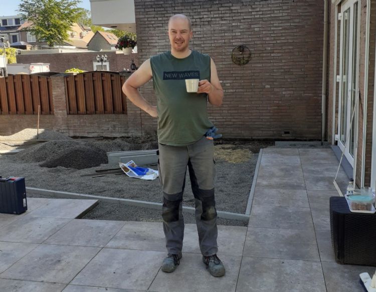 | Jeroen Dijkstra neemt even pauze na het voegen van de tegels |