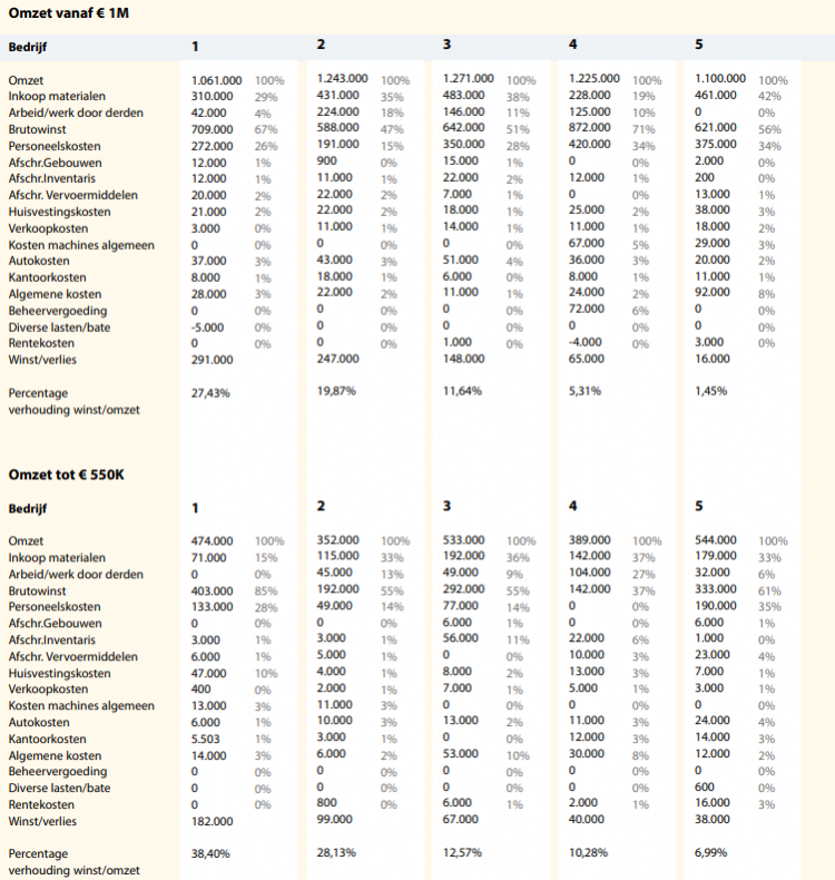 Voor een omzet van ruim 1 miljoen zijn er volgens Westra in het algemeen tien of meer full time equivalents (fte's) nodig. Anders gezegd, in spreektaal: tien of meer mensen die een fulltime dienstverband hebben. Westra: 'Zo'n dienstverband kan ook bestaan uit twee parttimers die samen als één fte tellen. Ook de ondernemer rekenen we als één fte, alhoewel de gemiddelde ondernemer waarschijnlijk veel meer uren actief is.' Het werk van derden, ook wel inhuur genoemd, wordt in het beoordelen van de cijfers, voor het bepalen van het aantal facturabele uren in dit kader, als personeel gerekend en teruggerekend naar fte's, aldus Westra. Wat volgens Westra direct opvalt binnen deze categorie bedrijven, zijn de grote verschillen onderling qua winst. Westra: 'Omdat ik de ondernemers en bedrijven persoonlijk ken, weet ik wat ze doen.'