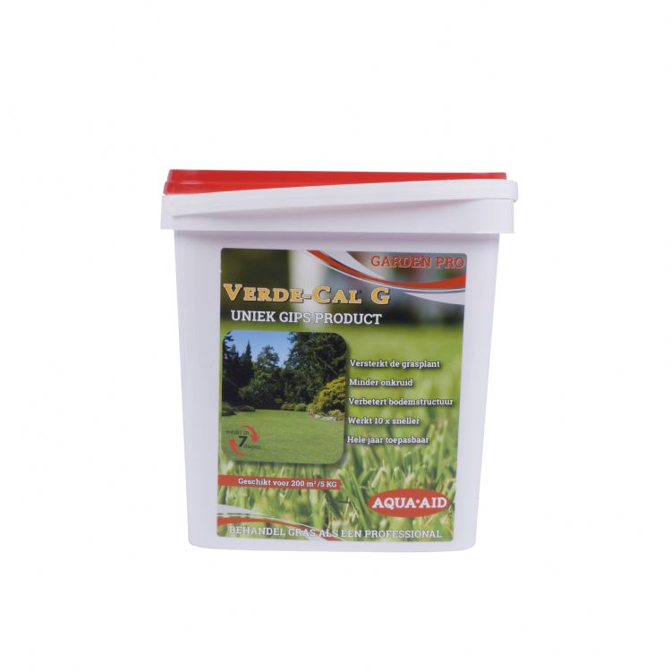 VerdeCal G is een kalkproduct dat de bodem verbetert en bemesting doeltreffender maakt. Het versterkt de grasplant en vermindert onkruid. VerdeCal G verbetert de bodemstructuur en werkt tien keer sneller dan reguliere kalkproducten. Aqua Aid adviseert om VerdeCal G minimaal twee keer per jaar toe te passen. Toepassingsadvies is 2,5 kilogram per 100 vierkante meter gazon. Direct na het aanbrengen het gazon met water besproeien. VerdeCal G is beschikbaar in een verpakking van 5 kilo en grotere zakken van 23 kilo.