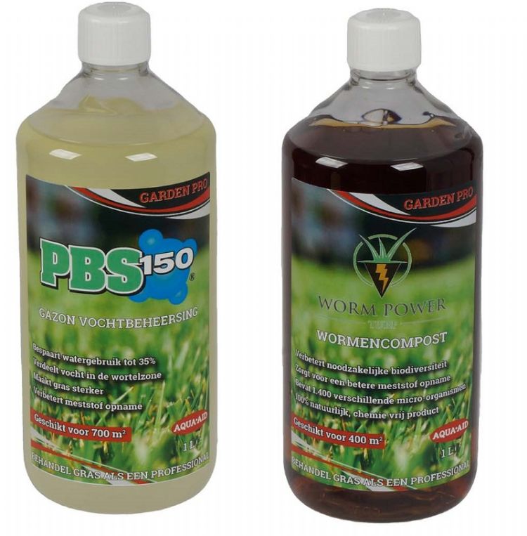 PBS150 is een vochtregelaar die vocht vasthoudt bij de wortel, zodat de kans op verdroging vermindert en de plant minder stress heeft. PBS150 is beschikbaar in korrel en vloeibare vorm. De korrelvariant is eenvoudig aan te brengen met een meststrooier. De vloeibare variant is efficiënter in gebruik en is toepasbaar met een gieter of (rug)spuit. Toepassing van PBS150 zorgt voor een besparing in water tot wel 35 procent en verdeelt vocht bij de wortel. Dit maakt het gazon sterker en verbetert ook de meststofopname. Aqua Aid adviseert PBS150- of PBS150-granulaat toe te passen aan het begin van het groeiseizoen (medio april) en te herhalen na drie maanden.