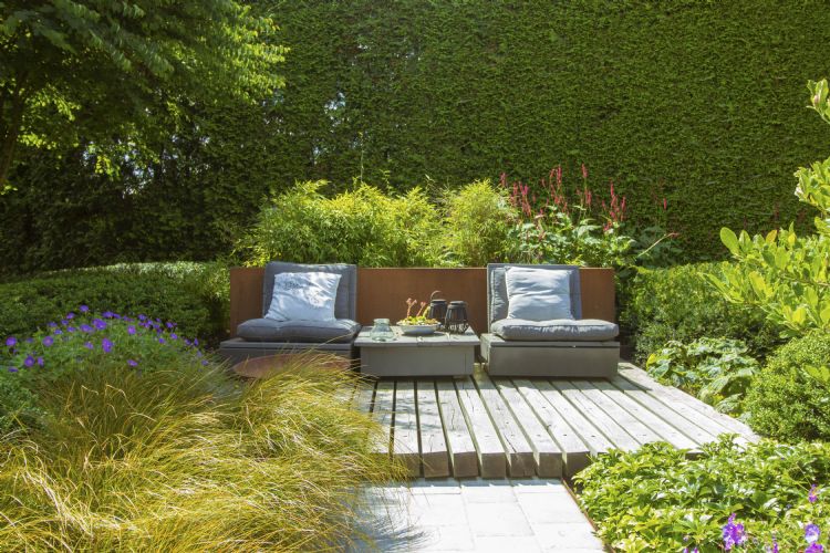 | Romantische tuin met eiken balken vlonder en cortenstaal achterwand |