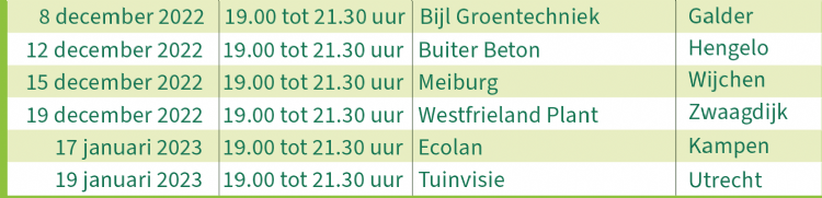 Van 15 november tot en met 19 januari kun je de workshops bezoeken. Zie voor de precieze locaties en data hieronder de tabel. Alle workshops zijn van 19:00 tot 21:30. Er wordt gezorgd voor een hapje en een drankje. Inschrijven kan op de website van TuinKeur.