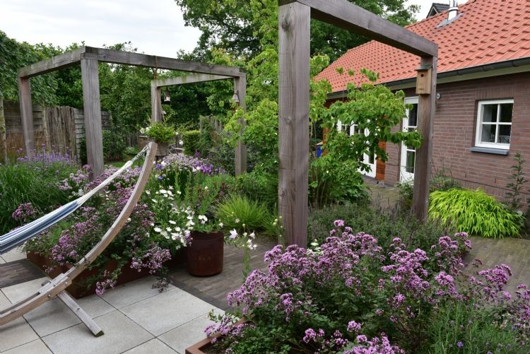 Het ontwerp is ruimtelijk, maar toch verrassend door vele doorkijkjes en een mix van materialen. Het ontwerp en realisatie duo is tegen de redactie kort van stof over hun werk. Maar wat ons betreft zeggen de foto's voldoende. Tuinontwerper Frank Stegers: 'We hebben hier verschillende natuurlijke materialen gebruikt, verhoogde borders, hoogte- en dieptewerking door de pergola. De gevariƫerde en uitgebalanceerde beplanting maken dat het geheel groen en fris oogt.' Verder verrast de tuin door de aanwezigheid van een kippenren en hangmat.