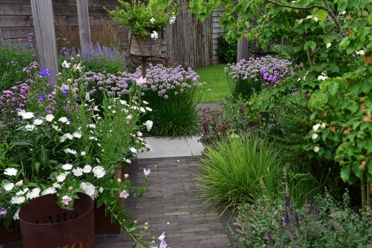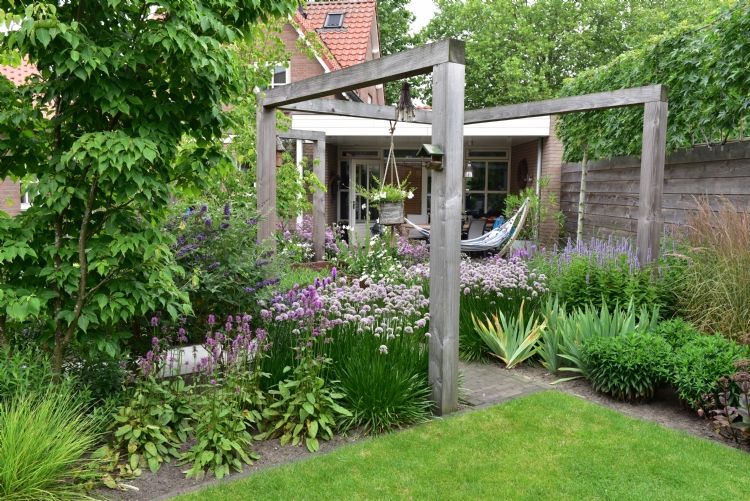 | | Door de beplanting op verschillende hoogtes te verwerken oogt het geheel vol en groen. |