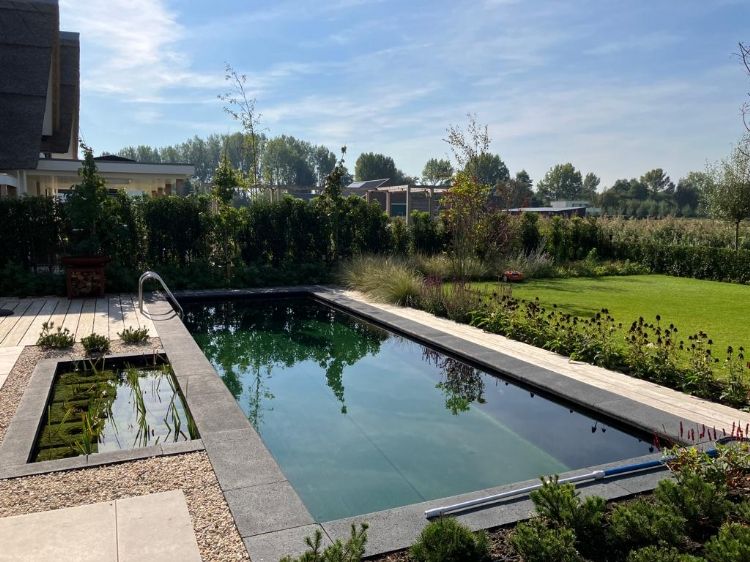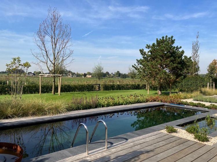 De tuin heeft een strakke indeling, maar verzacht door de aanwezigheid van het vele en bijzondere groen. Roald van Genderen: 'Het maatwerk natuurzwembad is een wens die in vervulling gaat voor de bewoners. De tuin heeft enkele bijzondere items zoals een buitendouche, maatwerk berging, stoere overkapping en composiet muurelementen. Verder is het voorzien van de nodige techniek, zoals een warmtepomp voor het zwembad, automatische tuinberegening en robotmaaiers. De tuinverlichting maakt de tuin ook in de avonduren erg bijzonder. Wij zijn trots op deze tuin en vinden dat deze buitenleven op zijn best uitstraalt.'
