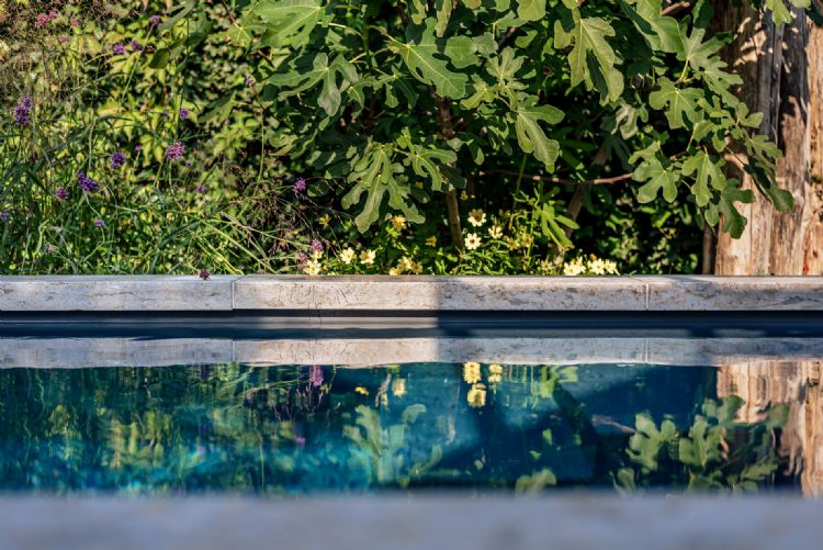 Voor dit project is gewerkt met een speciaal door TRIVIUM geselecteerde kalksteen uit Zuid-Duitsland. Deze grijze steen met warme roest kleurige tinten past perfect in het eindplaatje. Verder is het buitenverblijf is voorzien van een verdiept niveau met maatwerk loungebank en haard, zo wordt een geborgen en intieme sfeer gewaarborgd.