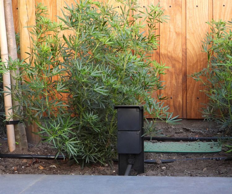 De Harenaar loopt met de Glampère New Hydro-tuinpaaltjes weg. 'Dit zijn heel degelijke stopcontacten die al heel lang worden gemaakt. Hoewel Niko New Hydro ook verkrijgbaar is in wit, vind ik vooral de zwarte stopcontacten prachtig. Gemonteerd in een tuinpaaltje geven ze een mooie zwarte uitstraling, zowel van de voor- als de achterkant. De aansluitsnoeren van de spots zijn meestal ook zwart, dus ziet het geheel er strak uit. Bovendien valt het niet te veel op. Het gaat namelijk om het licht. De paaltjes met stopcontact zijn zwart rvs-gecoat; dat oogt beter bij de huidige, strak vormgegeven tuinen en huizen dan de houten paaltjes van voorheen.'