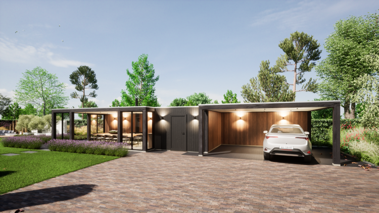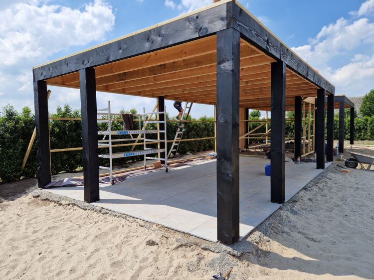 | | In één gebouw zijn een veranda gecombineerd met een keuken annex bar en een carport gerealiseerd. |