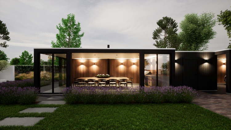 Roald Tuindesign integreert houten bijgebouw naadloos in villatuin |