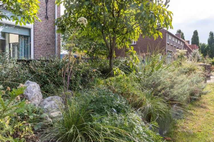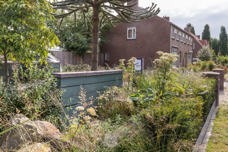Tuinstudio Tom heeft een groene voortuin gerealiseerd die volgens ontwerper Tom Poppelaars elk seizoen garant staat voor verrassingen. De beplanting, geleverd door Kwekerij & Plantencentrum Schonenberg, bestaat voor de helft uit inheemse soorten. De zinken randen zijn geleverd door Adezz, de grondverbetering is uitgevoerd door Den Ouden Groep.