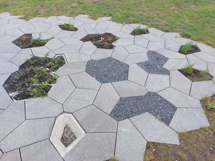 De waterdoorlatende tegels en klinkers in het Eco Solutions-gamma behoeven geen brede voegen, maar bevatten een poreuze structuur die het water door de tegels afvoert. De waterpasserende tegels en klinkers met hun strakke lijnen of vrolijke hoekige vormen leiden het water naar de ondergrond via de brede voegen. Een interessant voorbeeld vormt de Bowler. Dit is een klein formaat waterpasserende klinker met tien procent open voegen en een lichte ronding aan de hoeken waarmee een golvend effect of andere speelse legpatronen mogelijk zijn. De Bowler is in vijf kleuren (Terre Cuite, Nuance, Carbon, Grijs en Turf) beschikbaar. Dankzij de nokken stroomt het regenwater meteen via de voegen de grond in. In combinatie met een waterdoorlatende fundering en straatlaag bieden deze Eco Solutions moeiteloos het hoofd aan hevige stortbuien.