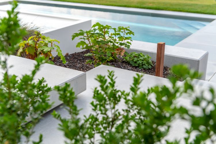 Tuinmeubilair, zoals banken, planters, zitelementen, waterpartijen en andere elementen, is eveneens van fluweelzacht gepolijst beton vervaardigd. Alle Smooth-elementen bevatten fijn granulaat dat door het polijsten in het beton is verzonken. Kies het tuinmeubilair in dezelfde kleuren als de tegels, boordstenen en trappen en er ontstaat een indrukwekkende luxe terraslook. Een bijkomend voordeel van betonnen meubilair is het gebrek aan onderhoud, want het kan tegen regen en vorst.