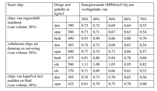 Om ten slotte een indruk te geven van de verschillen in energiewaarde van houtchips bij verschillende vochtgehalten, een tabel uit 1995. Deze heeft gestaan in: Aptering och Virkeskännedom; SLU info/Skog, Garpenberg (1995). Zo heeft berkenhout (490 kg droge stof per m3) bij een vochtgehalte van 30 procent een calorische waarde van 0,93 MWh per kuub.