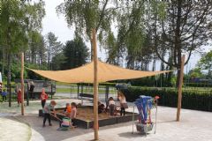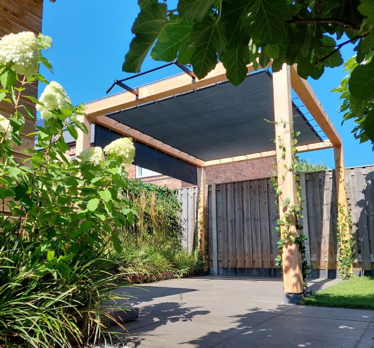 Ook schaduw komt terug in de ontwerpen. De Kloe: 'Onze ontwerper kijkt goed naar de omgeving waarin de tuin ligt, zoals een bosrijke omgeving of een woonwijk. Ook kijkt hij naar de ligging van de tuin ten opzichte van de zon. Ligt hij op het noorden, dan hoeven er minder schaduwplekken ontworpen te worden. Ligt hij op het zuiden of zuidwesten, dan zullen de bewoners meer last krijgen van hitte in hun tuin, zeker met de temperaturen zoals we die de afgelopen jaren hebben gehad. Het is daarom verstandig om al in de ontwerpfase over schaduw na te denken en de klant daarin mee te nemen. Schaduw zorgt voor minder warmteopname en -afgifte en beschermt ook tegen uv-straling. Schaduwdoeken zijn een kostenefficiënt alternatief voor een veranda of overkapping.' Bij de Kunst van het Scheppen merken ze dat de klant graag een overgang ziet van 'binnen' naar 'buiten'. 'Daarom passen we in een houten pergolaconstructie weleens lucht- en waterdoorlatende schaduwdoeken van ZONZ sunsails toe. We kiezen overigens bijna altijd voor lucht- en waterdoorlatende schaduwdoeken, ook als we onder afschot aanleggen. Die kunnen blijven hangen bij een regenbui en vormen geen waterzak. We gebruiken ook regelmatig losse schaduwdoeken op zit- en speelplekken. Die zijn dan vaak gemonteerd aan losse acaciahouten palen of aluminium telescoopmasten, of geïnstalleerd via spandraden vanaf een hoger gelegen gedeelte zoals een balkon. Denk daarbij aan een plek zoals boven een zandbak.'