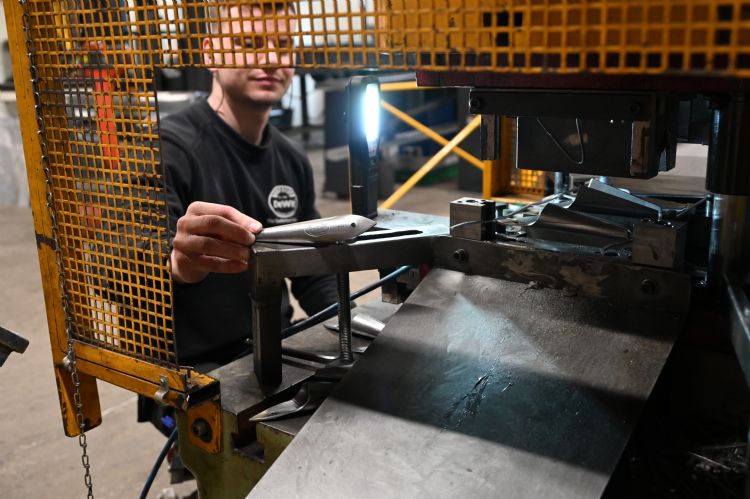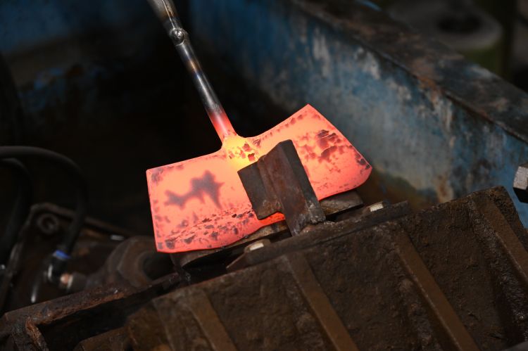 Het gloeiend hete blad wordt in de smeedpers gevormd. Nu ontstaat het taps toelopende blad.