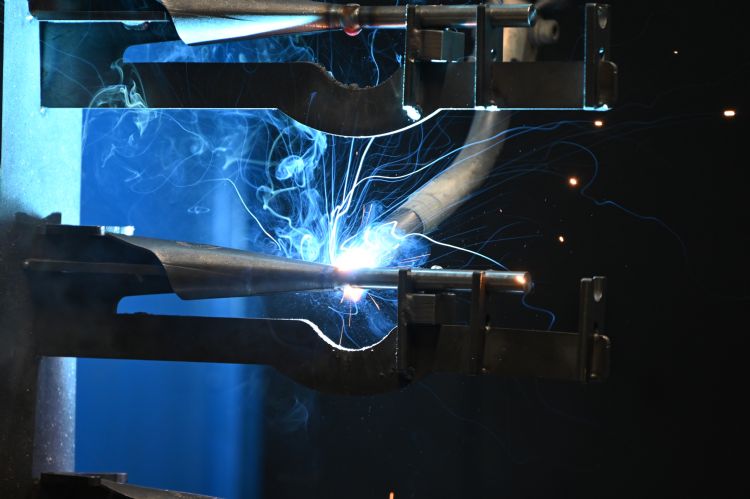 Bij de volgende stap wordt het schoffelhuisje aan het stiftje gelast. Ook dit proces is bijna volledig geautomatiseerd. De onderdelen worden handmatig klaargezet en de lasrobot klaart de klus.