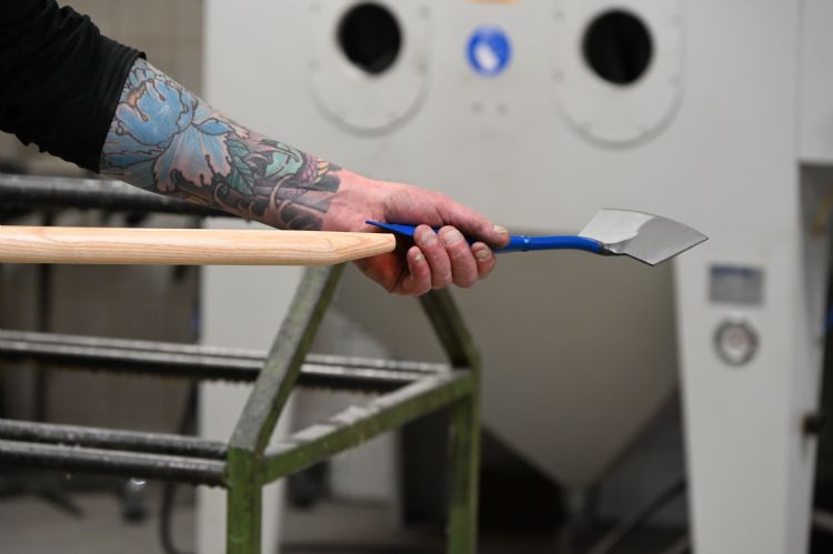 Vervolgens wordt het schoffelblad geslepen. Dit proces gebeurt nog handmatig.