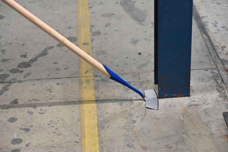 Na het bevestigen van de steel wordt ook weer handmatig gecontroleerd of de knik goed in de steel zit. Staat het blad recht op de grond?