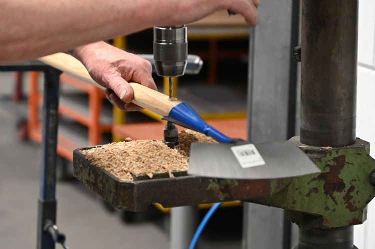 Nu duidelijk is dat het blad en de steel goed zitten, is het tijd voor de bevestiging. Er wordt handmatig een gat in de steel geboord.
