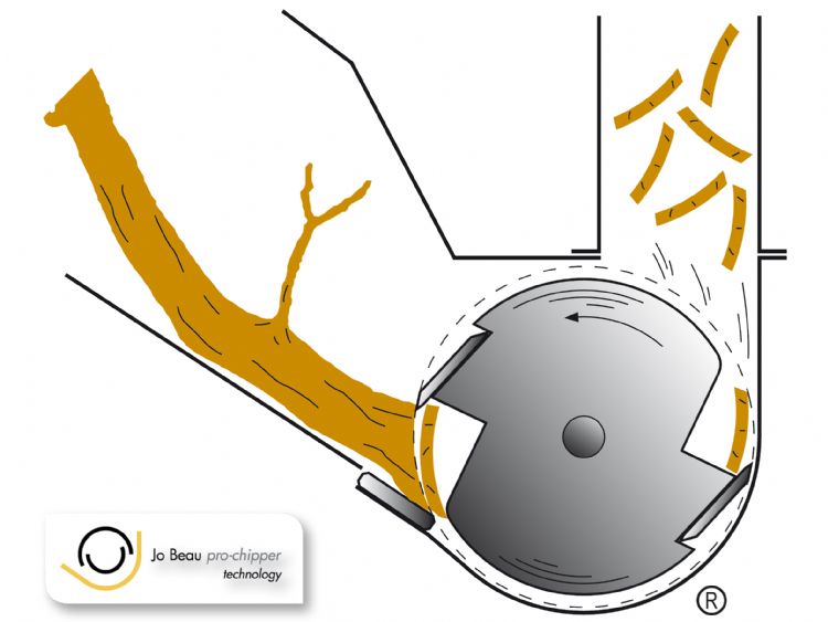 De reeds 25 jaar bestaande Trommeltechnologie van Jo Beau trekt zowel takken als het bijhorende groen op ergonomische wijze naar binnen en chipt ze. De machine werpt de houtsnippers daarna met hoge snelheid en grote kracht uit. Jo Beau was destijds de eerste producent met een messentrommel met tegenmes op compacte machines. Hierbij is sprake van boveninvoer van de takken. De slijpsnede van de messen zorgt voor het binnentrekken van het hout. Productmanager Menno Plooij licht toe: 'Het geheim hiervan is de combinatie van een scherpe messenset en de correcte hoek waaronder die geslepen is. Het hout wordt geknipt op een tegenmes. Dat is tot viermaal draaibaar voordat vervanging nodig is. Het tot ongeveer 6 millimeter geknipte hout wordt door de middelpuntvliedende kracht uitgeworpen, circa 7 tot 8 meter ver. Uiteraard maak je hierbij gebruik van een draaibare uitblaaspijp. Deze kan nooit in de richting wijzen van degene die de machine met takken voedt.'