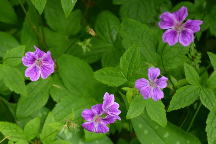 De laatste jaren is er een ontwikkeling gaande in nieuwe cultivars van Geranium nodosum, naast Geranium phaeum en G. macrorrhizum één van de weinige Geranium-soorten die goed in de schaduw kunnen staan en enige droogte tolereren. Het is misschien niet een plant waar je meteen aan denkt, maar hij is zeer de moeite waard. De soort maakt uitlopers of zaait zich flink uit op humusrijke grond; de cultivars houden zich rustiger. Door het afwijkende frisgroene blad met een klein beetje glans is de plant ook interessant zonder bloem. Hij sterft in de winter af en is daarom geschikt om er schaduwminnende bloembolletjes tussen te planten. De witbloeiende vorm heet 'Silverwood'. 'Clos du Coudray', afkomstig uit een Franse tuin, bloeit lilapaars met een licht randje; de wilde variant, die van Frankrijk tot in Servië voorkomt, is effen roze. Alle varianten worden tussen de 30 en 40 cm hoog en bloeien van juni tot mogelijk in november.